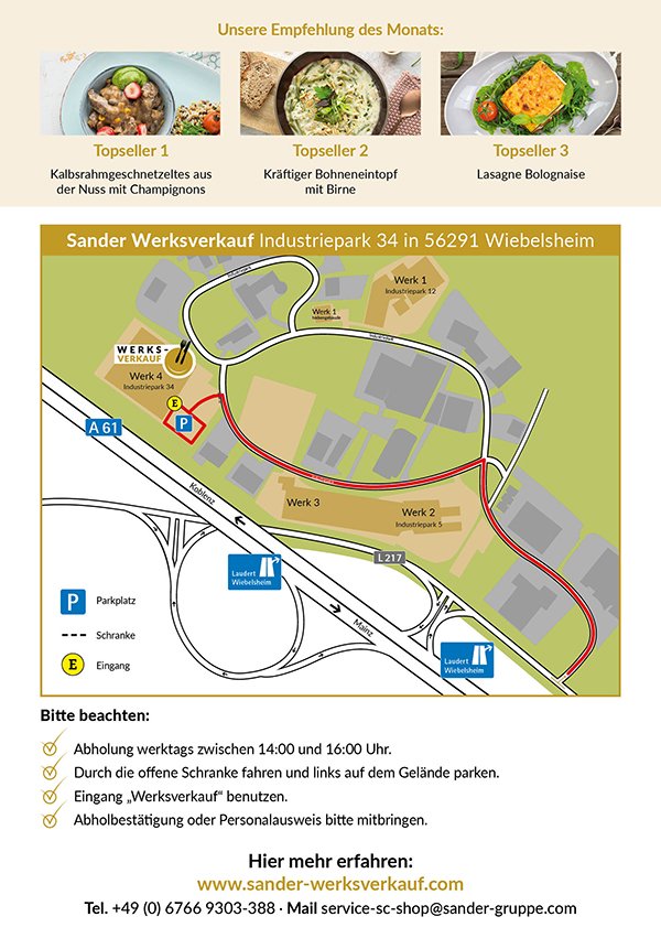 Wie kann ich Produkte aus der Sander Frische-Manufaktur kaufen? Sander hat zu diesem Zweck einen eigenen Online-Shop erstellt, über den Privatpersonen bestellen können. Jedes einzelne Produkt zeigt neben Preisen alle auch für die Gastronomie vorgeschriebenen Informationen auf, von Zutaten über Allergene und Nährwerte bis hin zu Haltbarkeit, Ernährungsformen und Zubereitungshinweise. Die bestellten und vorab mit elektronischen Zahlungsmitteln bezahlten Produkte können dann in der zentral an der A61 gelegenen Sander Frische-Manufaktur in Wiebelsheim ähnlich wie bei einem klassischen Werksverkauf abgeholt werden. Dazu erhält man per E-Mail nach Bestellung und Bezahlung im Online-Shop eine Abholbestätigung inklusive Abholdatum.