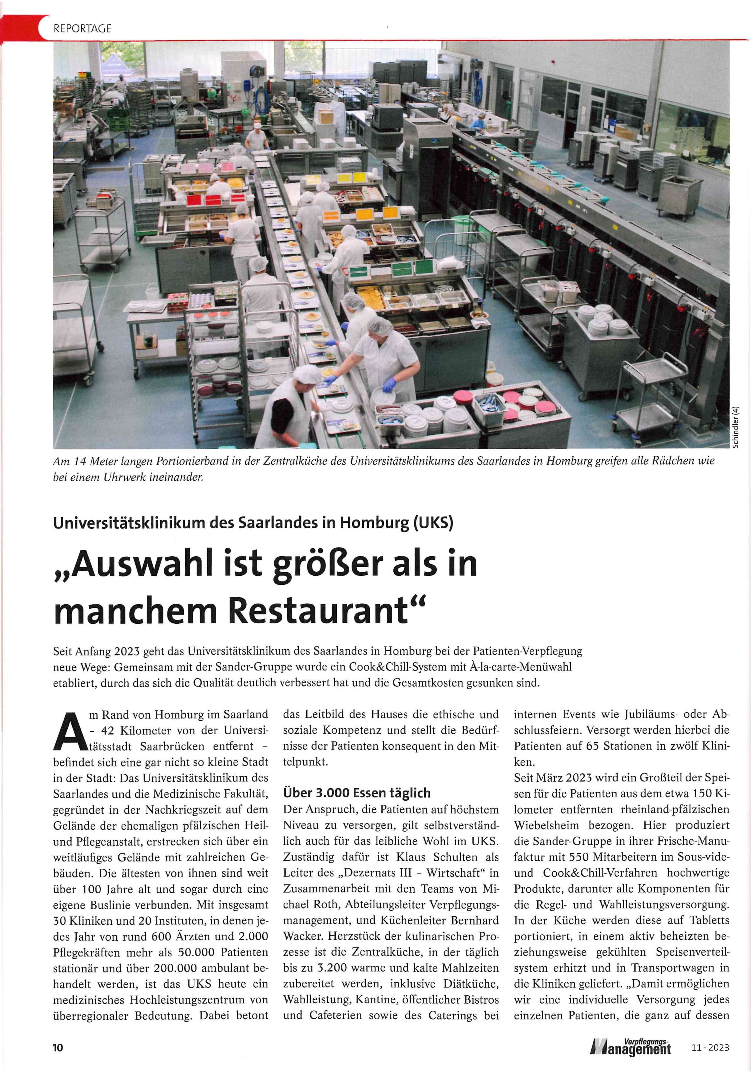 In der aktuellen VerpflegungsManagement (Fachzeitschrift für professionelle Verpflegung in der Care-Gastronomie) wird die Patienten-Verpflegung am Universitätsklinikum des Saarlandes (UKS) vorgestellt. Seit Anfang 2023 hat das UKS gemeinsam mit Sander ein Cook & Chill-System mit À-la-carte-Menüwahl etabliert, durch das sich die Qualität deutlich verbessert hat und die Gesamtkosten gesunken sind.