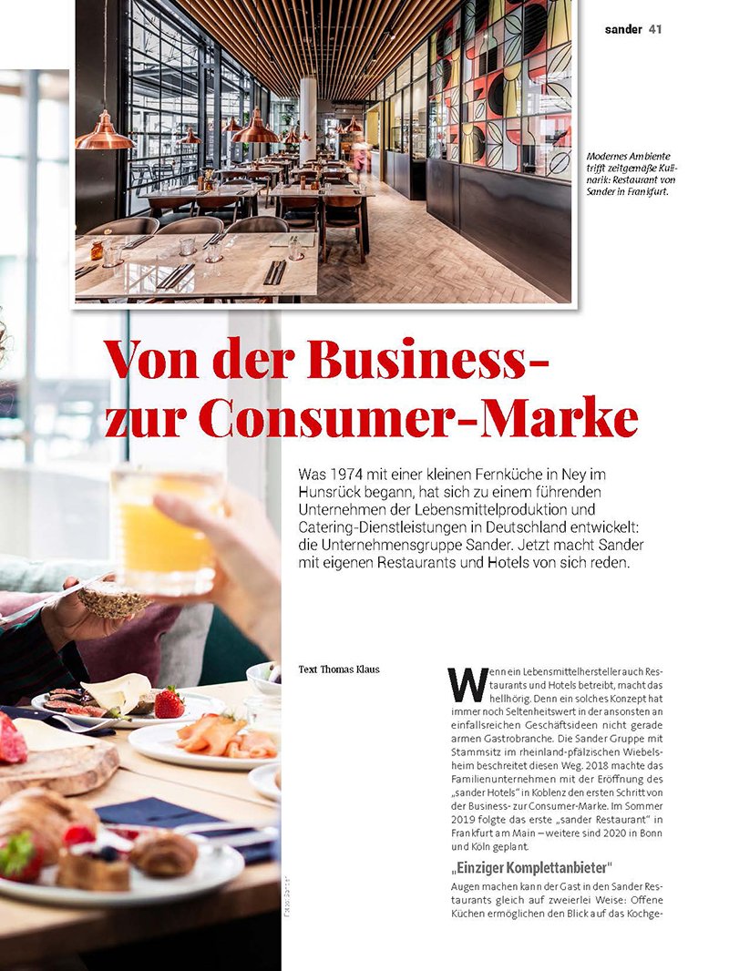 Wenn ein Lebensmittelhersteller auch Restaurants und Hotels betreibt, macht das hellhörig. Denn ein solches Konzept hat immer noch Seltenheitswert in der ansonsten an einfallsreichen Geschäftsideen nicht gerade armen Gastrobranche. Die Sander Gruppe mit Stammsitz im rheinland-pfälzischen Wiebelsheim beschreitet diesen Weg. 2018 machte das Familienunternehmen mit der Eröffnung des „sander Hotels“ in Koblenz den ersten Schritt von der Business- zur Consumer-Marke. Im Sommer 2019 folgte das erste „sander Restaurant“ in Frankfurt am Main – weitere sind 2020 in Bonn und Köln geplant.