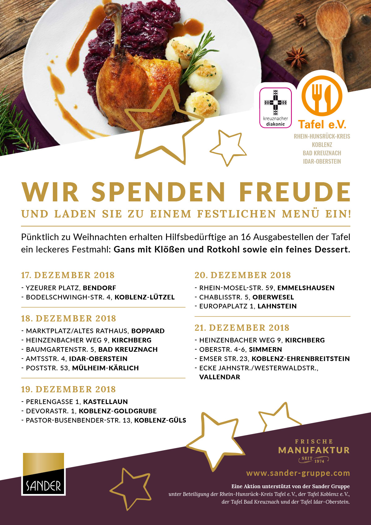 Zu den Traditionen des Weihnachtsfests gehört neben einem Christbaum auch ein genüssliches Weihnachtsessen. Doch viele alleinstehende Menschen und Familien befinden sich in existenziellen Notlagen und können sich kein Festmahl leisten. Unter dem Motto „Wir spenden Freude“ verteilen die Tafeln in Mülheim-Kärlich, Bendorf, Vallendar, Koblenz, Lahnstein, Boppard, Oberwesel, Emmelshausen, Simmern, Kirchberg, Kastellaun, Idar-Oberstein und Bad Kreuznach zwischen dem 17. und 21. Dezember Weihnachtsmenüs der Sander Frische-Manufaktur an Bedürftige. Verschenkt werden in diesem Jahr wieder Gänsekeulen mit Klößen und Rotkohl sowie einem feinen Dessert.